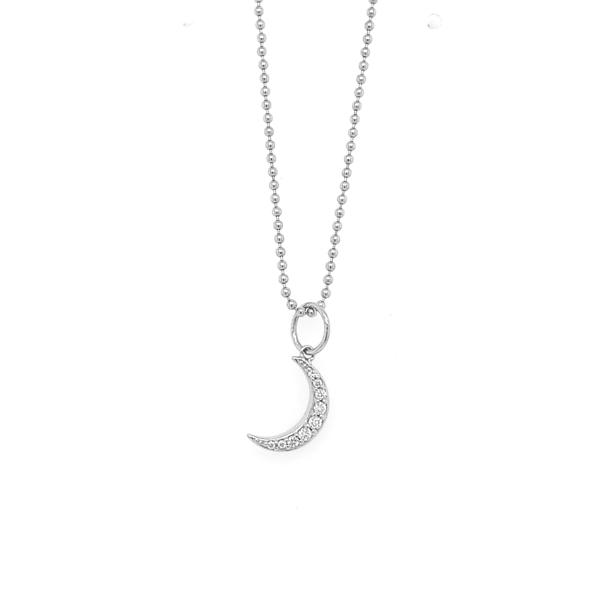 The 14k gold baby MOON charm features white diamonds in a paved setting. A perfect gift for that someone special. Perfect compliment to our MOON stud earrings. Available with chain, or as Charm Only.