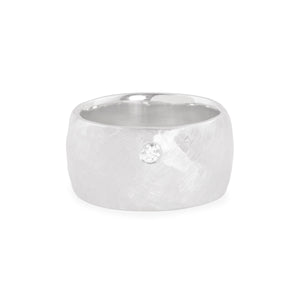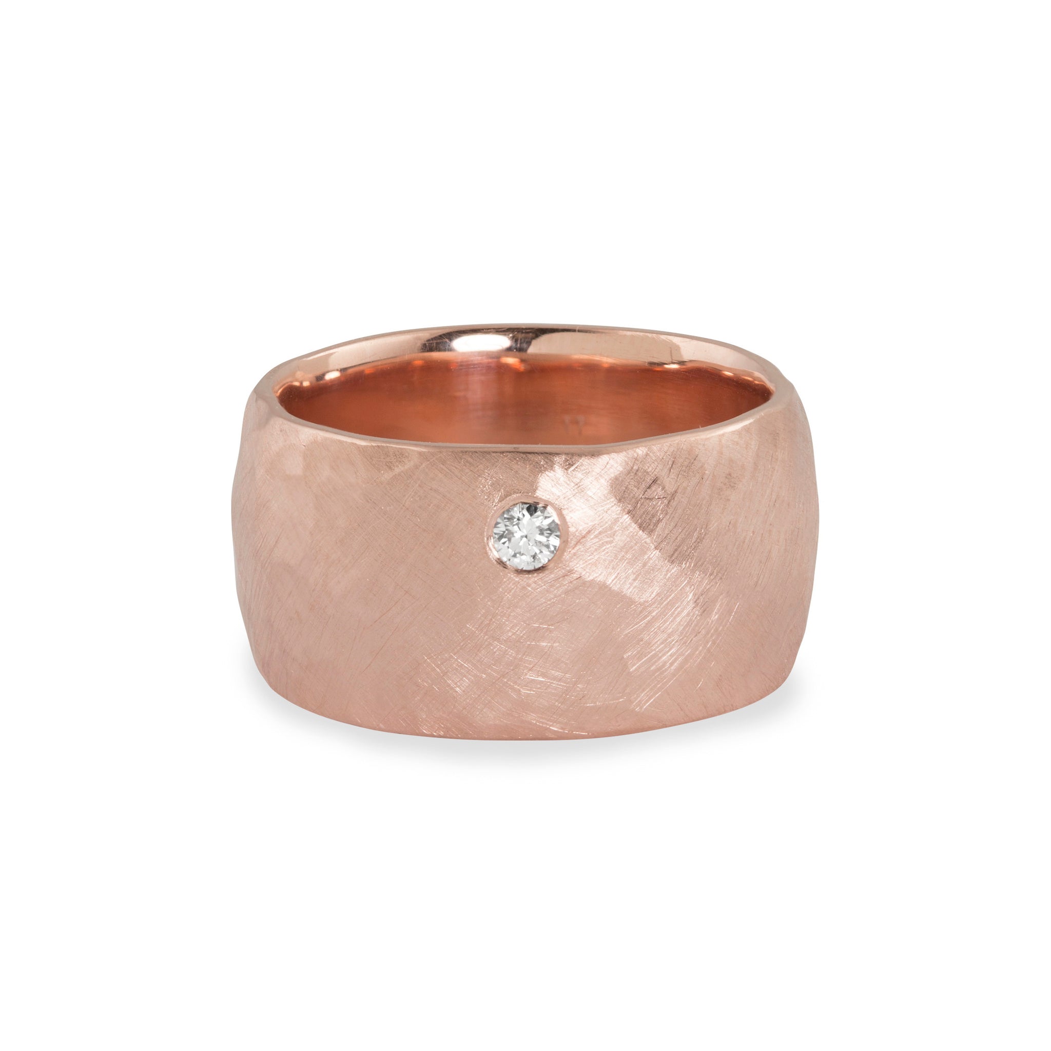 The 14k gold RAMA ring is a wide hammered band with a satin finish and a single set diamond.  Very comfortable fit and perfect as an individual band, or stacked with other thinner bands.